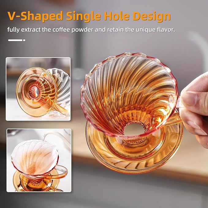- V 60° Spiral Glass Dripper:The spiral rib design slows down water flow, increasing contact time with coffee grounds for optimal extraction, delivering a rich, balanced, and aromatic cup of coffee.